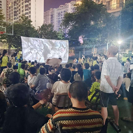 露天播放電影的形式,自由隨意的觀影氣氛,讓觀影人員更真切的體驗(yàn)艱苦奮斗的那個(gè)年代,革命先輩的付出與奮斗。放映活動(dòng)現(xiàn)場反響熱烈,夜幕降臨,現(xiàn)場座無虛席。業(yè)主們有的自帶板凳、有的駐足站立、有的直接席地而坐。物業(yè)工作人員精心布置著場地,還為業(yè)主準(zhǔn)備觀影小零食,業(yè)主們嗑著瓜子、吃著冰棍,都全神貫注地融入到劇情里,仿佛身臨其境。